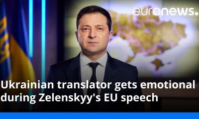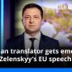 The official Ukrainian translator for the European Parliament (EU) appears to hold back tears as President Volodymyr Zelenskyy delivers a speech on the Russian invasion to...